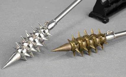 狼牙棒,一种头部像枣核般的木棒,把很多铁钉安全在木棒上,安装后的铁钉在木棒上,形状像狼的牙齿,得名为狼牙棒
