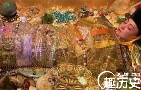棺中的慈禧身披盖被,织经文上万字,镶珍珠上百粒,明黄绸缎,价值连城。头戴凤冠,镶有珍珠,大如鸡蛋。口含明珠,百步照亮。脖挂朝珠,身着礼服,外罩珠褂,足蹬朝靴。身边充盈着佛像珊瑚,宝石珍珠。