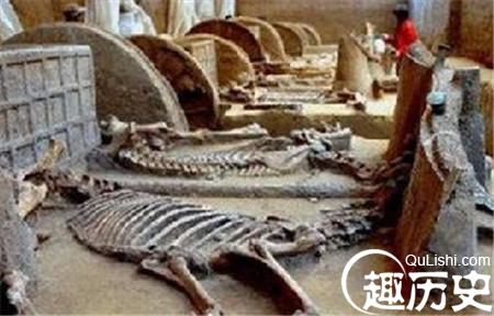 周幽王的墓修得十分高大,墓门打开后,往下全是白垩土,这土实际是一种石炭岩石,有一丈多厚。刘去的手下费了老大的力气,才挖去白垩土。再往下又看到了大量的云母石再往下挖了一尺多深,意外地看到了100多具尸体,纵横交错,相互枕靠,叠压在一起。其中只有一个男的,其余全是女的。有的坐着,有的躺着,有的站着,身上的衣服款式和活人穿的一样。已发掘的秦公一号大墓主是秦穆公,其墓的殉人之多令人触目惊心,殉人尸骨多达184具,墓室上下层的平台上摆放有殉人棺具,有的甚至是裸葬。